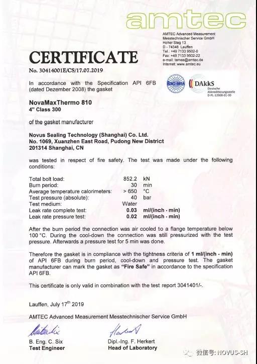 近期,我司Novus NovaMaxThermo 810型金屬纏繞墊片順利通過了API 6FB防火試驗認證。